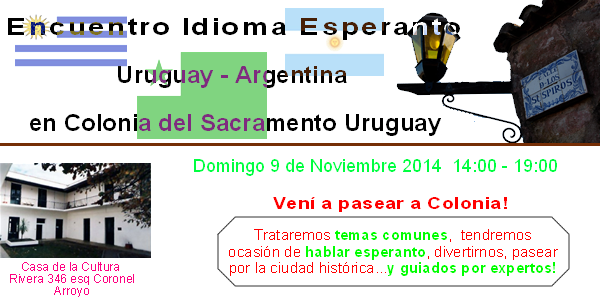 El Domingo 9 de Noviembre 2014 las Asociaciones de Esperanto de Uruguay y Argentina realizarán un Encuentro en la Ciudad de Colonia, Uruguay.